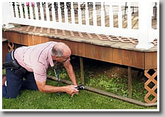 Many mortgage companies require Wood Destroying Insect Inspections. Here, Larry prepares to inspect the underside of a deck near Collegeville, PA.